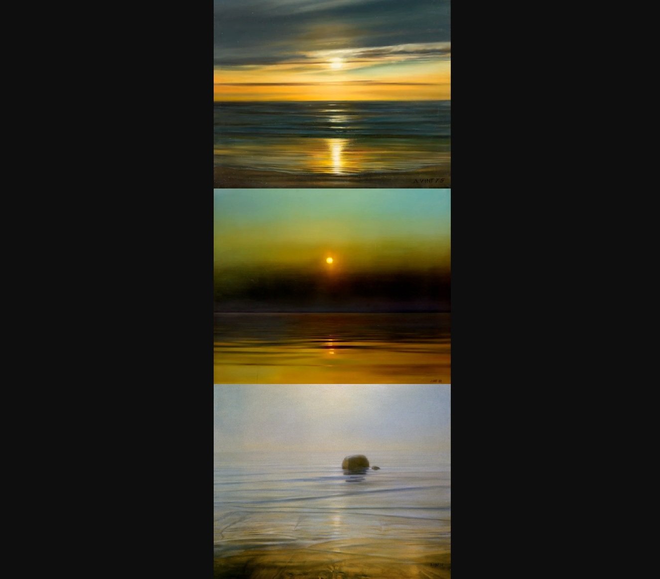 „Aili Vint’s first seascapes, at the comprehensive exhibition of her work of the 1970s, were amazing in their realistic elemental power. Silky-textured, smooth surfaces were masterfully executed. The artist encompassed the rich arsenal of the West’s classical seascape painters. Perspectives of air, effects of reflection, illusions of depth, laser-like transparency of water, and the shimmery, mysterious seabed as seen through expanses of water, awed us with their realistic credibility, as well as with their unprecedented, refined aestheticism. Our art world was enraptured and the same time, confused about how to relate to such a wealth of oncentrated beauty and mystery.